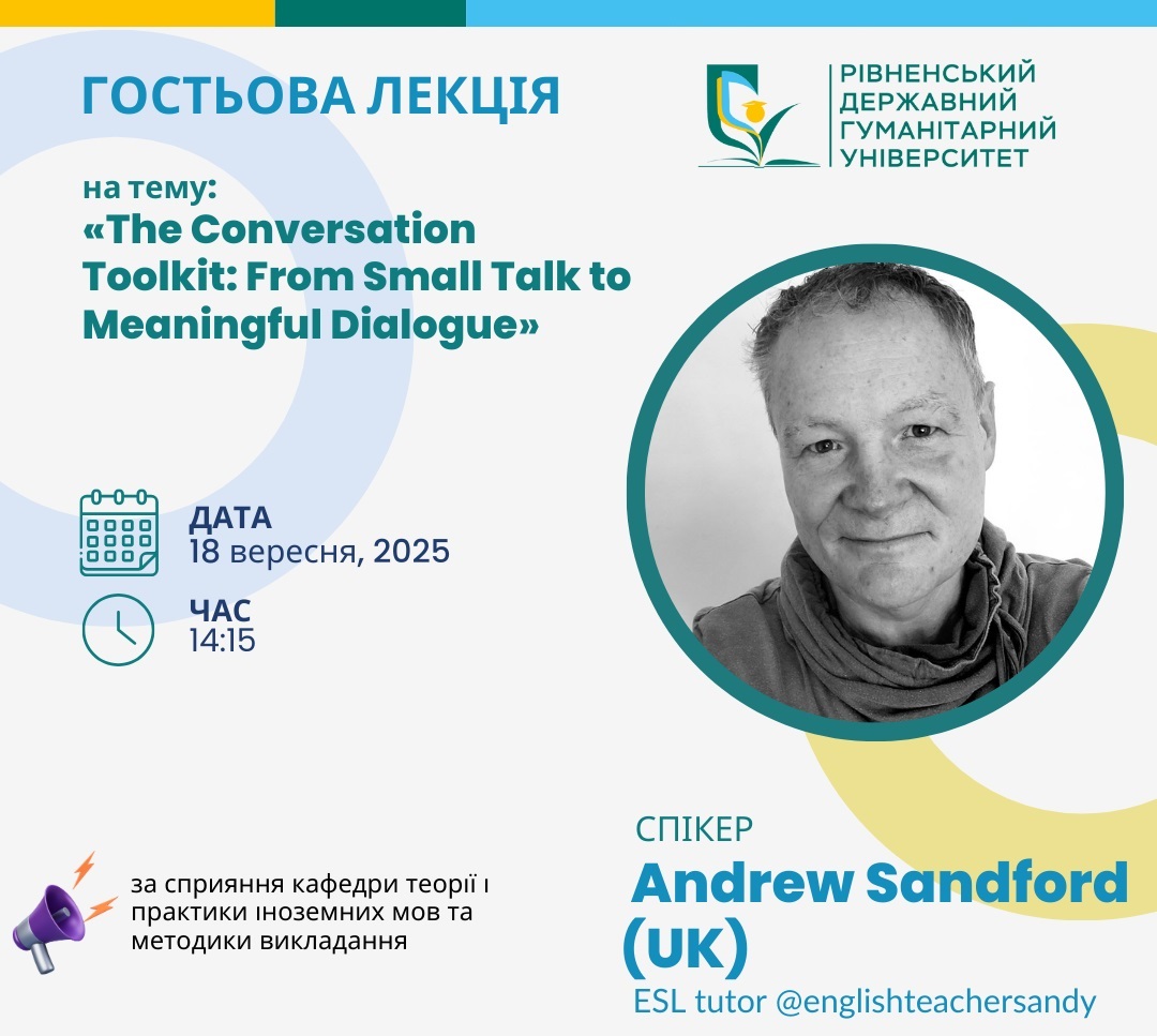 18 вересня 2025 року у рамках програми Гостьова Лекція Рівненський державний гуманітарний університет відвідав пан Андрю Сендфорд, відомий фахівець у галузі викладання англійської мови. Візит відбувся за ініціативи кафедри теорії і практики іноземних мов та методики викладання.