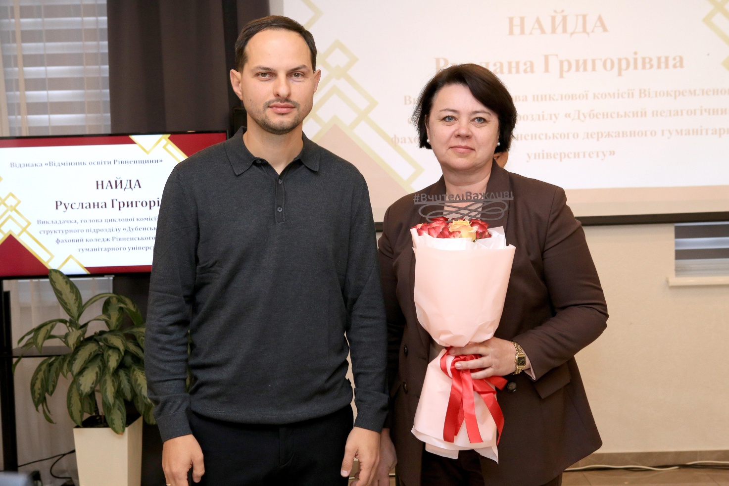 - У номінації «Фахова передвища освіта» почесну відзнаку «Відмінник освіти Рівненщини» отримала Руслана Найда, викладачка Відокремленого структурного підрозділу «Дубенський педагогічний фаховий коледж РДГУ».