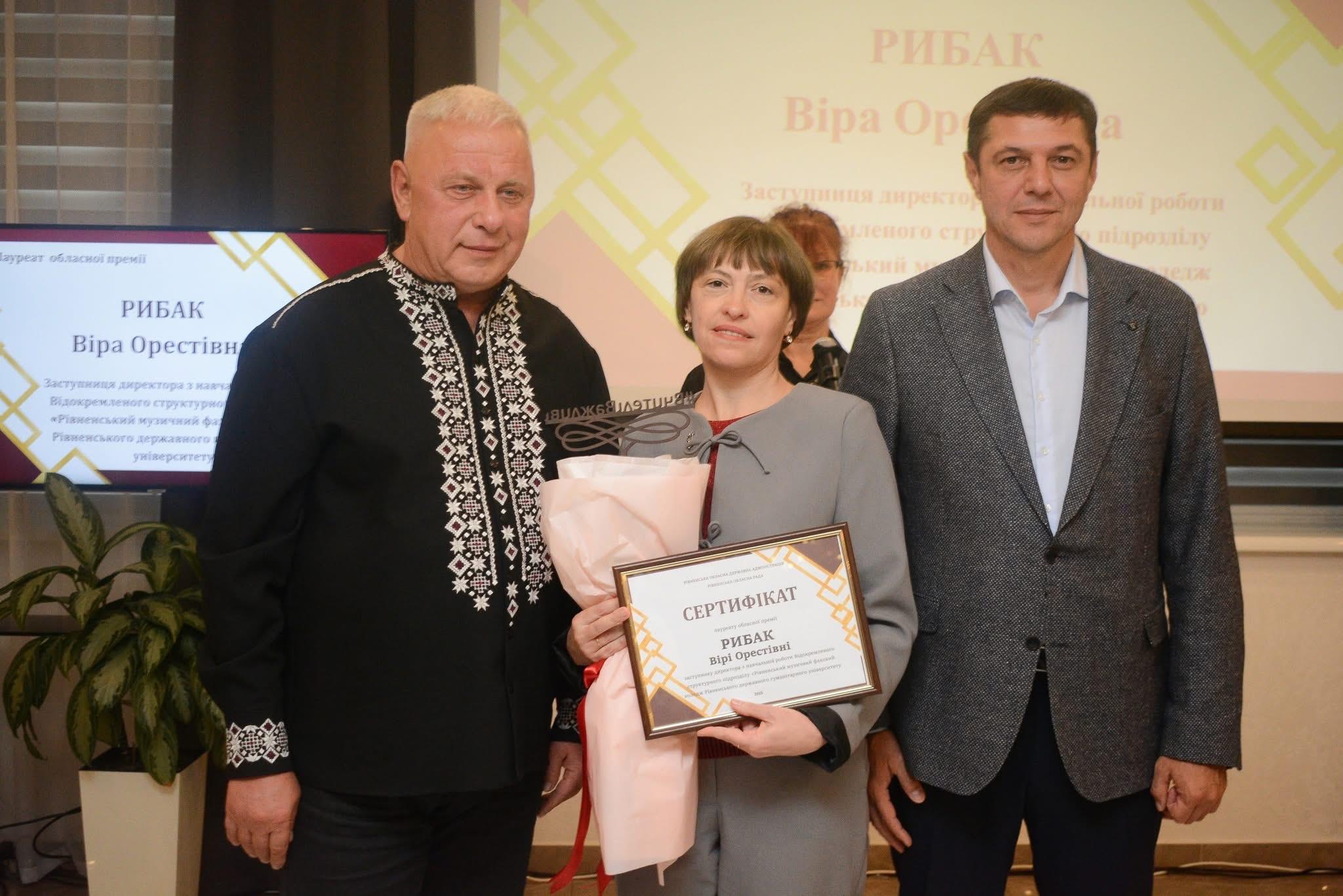 Лауреатом обласної премії у номінації «Фахова передвища освіта» стала Віра Рибак, заступниця директора з навчальної роботи Відокремленого структурного підрозділу «Рівненський музичний фаховий коледж РДГУ».