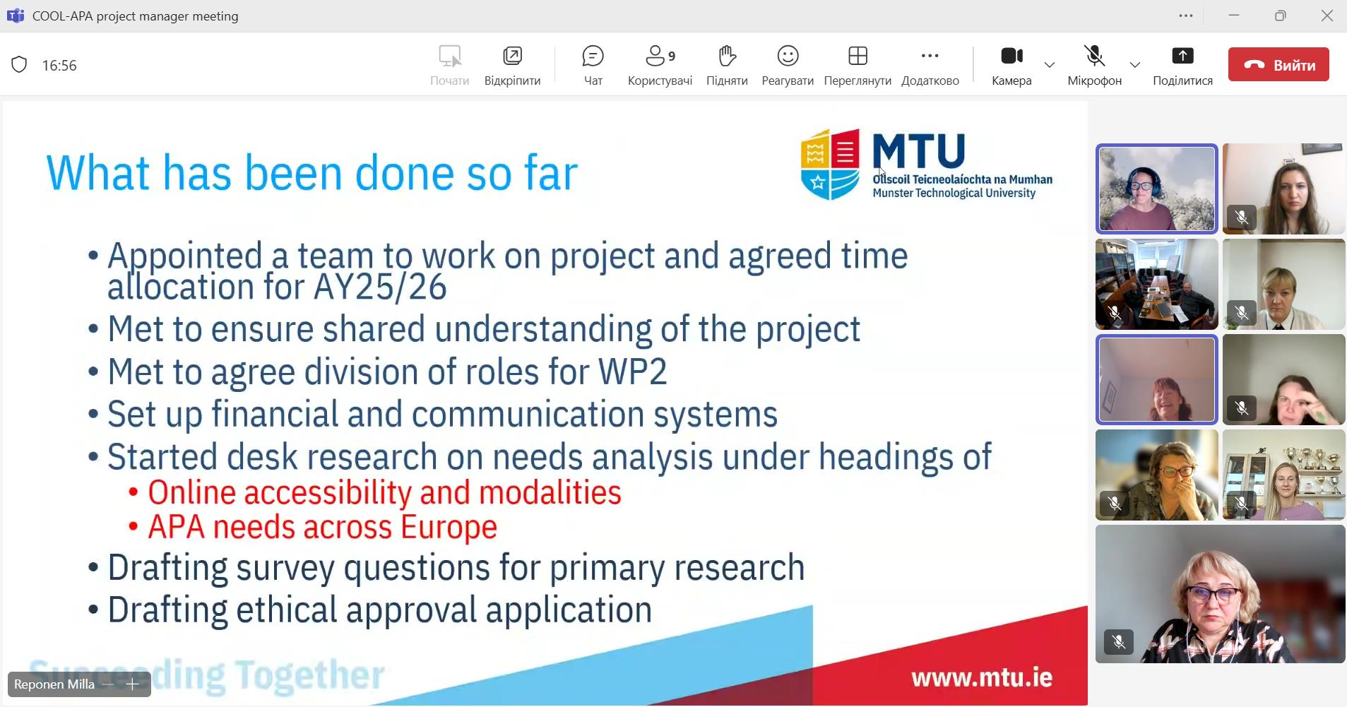 8 жовтня 2025 року відбулася чергова онлайн-зустріч менеджерів партнерів міжнародного проєкту COOL-APA 2025-1-FI01-RF220-HED-000357318 (Спільне онлайн- та очне навчання з адаптивної фізичної активності), що реалізується за підтримки Програми Erasmus+ (CBHE).