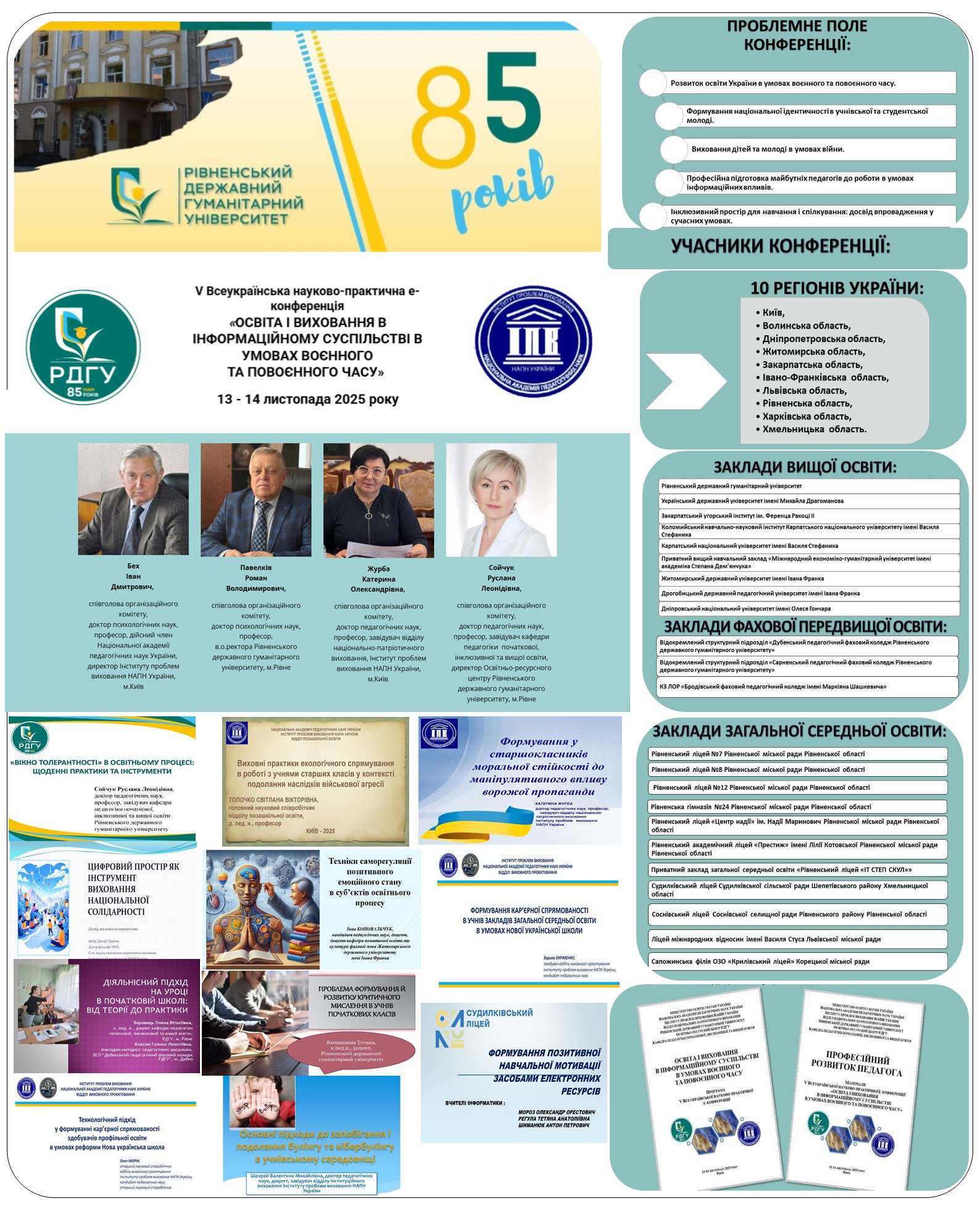 13-14 листопада 2025 року відбулася V Всеукраїнська науково-практична е-конференція «Освіта і виховання в інформаційному суспільстві в умовах воєнного та повоєнного часу», яка в цьому році проводилася в межах відзначення 85-річчя РДГУ. Співорганізатори конференції – Інститут проблем виховання НАПН України (доктор педагогічних наук, професор Катерина ЖУРБА, завідувач відділом національно-патріотичного виховання) та Рівненський державний гуманітарний університет (доктор педагогічних наук, професор Руслана СОЙЧУК, завідувач кафедри педагогіки початкової, інклюзивної та вищої освіти, директор Освітньо-ресурсного центру РДГУ).