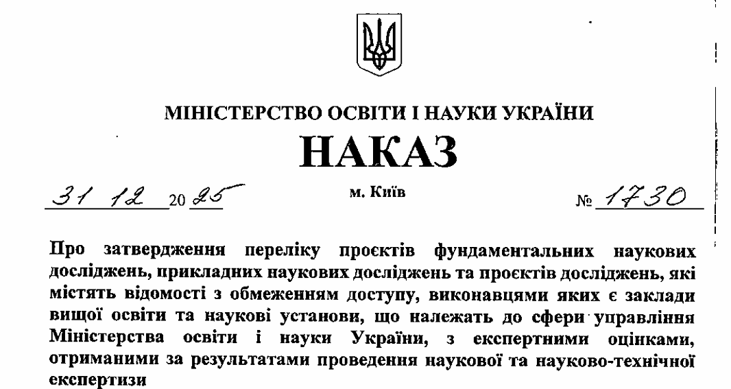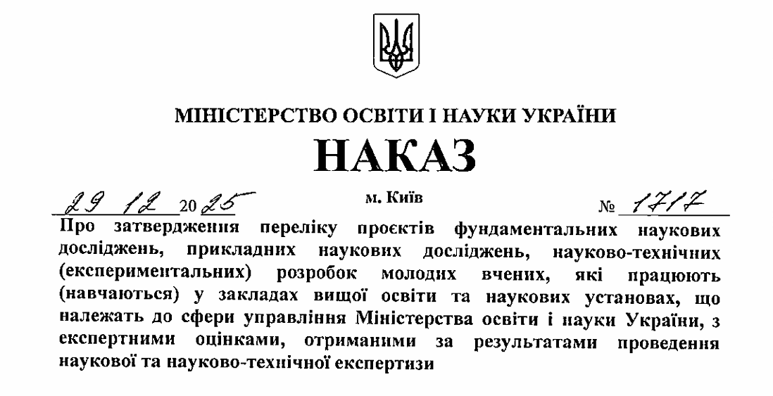 Міністерство освіти і науки України оприлюднило накази про затвердження переліку проєктів молодих учених і проєктів, поданих на основний конкурс наукових та прикладних досліджень університетів, із зазначенням експертних оцінок, сформованих за підсумками проведення наукової та науково-технічної експертизи.