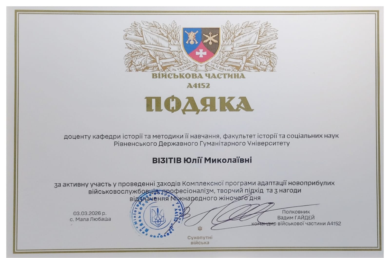 У контексті втілення Меморандуму про співпрацю між оперативним командуванням «Захід» і Рівненським державним гуманітарним університетом і проведення заходів Комплексної програми адаптації новоприбулих військовослужбовців, доценткою кафедри історії та методики її навчання факультету історії та соціальних наук Юлією ВІЗІТІВ було прочитано понад 30 публічних лекцій з циклу «Ритуал, пам'ять, ідентичність: культурна антропологія російсько-української війни». Це особлива сфера діяльності, адже на фахівців-істориків покладається відповідальна місія підтримка військових через глибше розуміння історії України, показ спадкоємності боротьби за свободу, надання інтелектуального опору в умовах війни, створення простору для діалогу та рефлексії пам’яті.