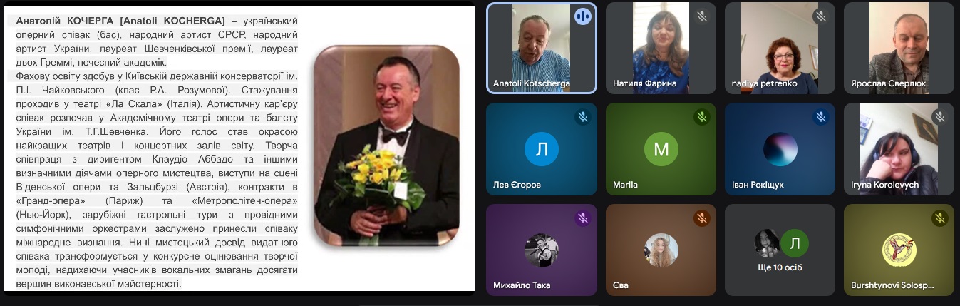 Анатолія КОЧЕРГА народний артист України, лауреат Шевченківської премії, професор, Голова журі Міжнародного конкурсу вокального мистецтва «Бурштинові солоспіви-JUNIOR».