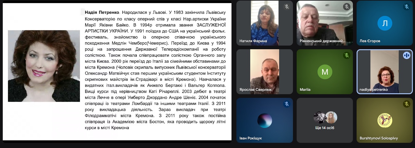 Надія ПЕТРЕНКО – заслужена артистка України, викладач співу при театрі Філодрамматічі міста Кремона (Італія), член журі Міжнародного конкурсу вокального мистецтва «Бурштинові солоспіви-JUNIOR».