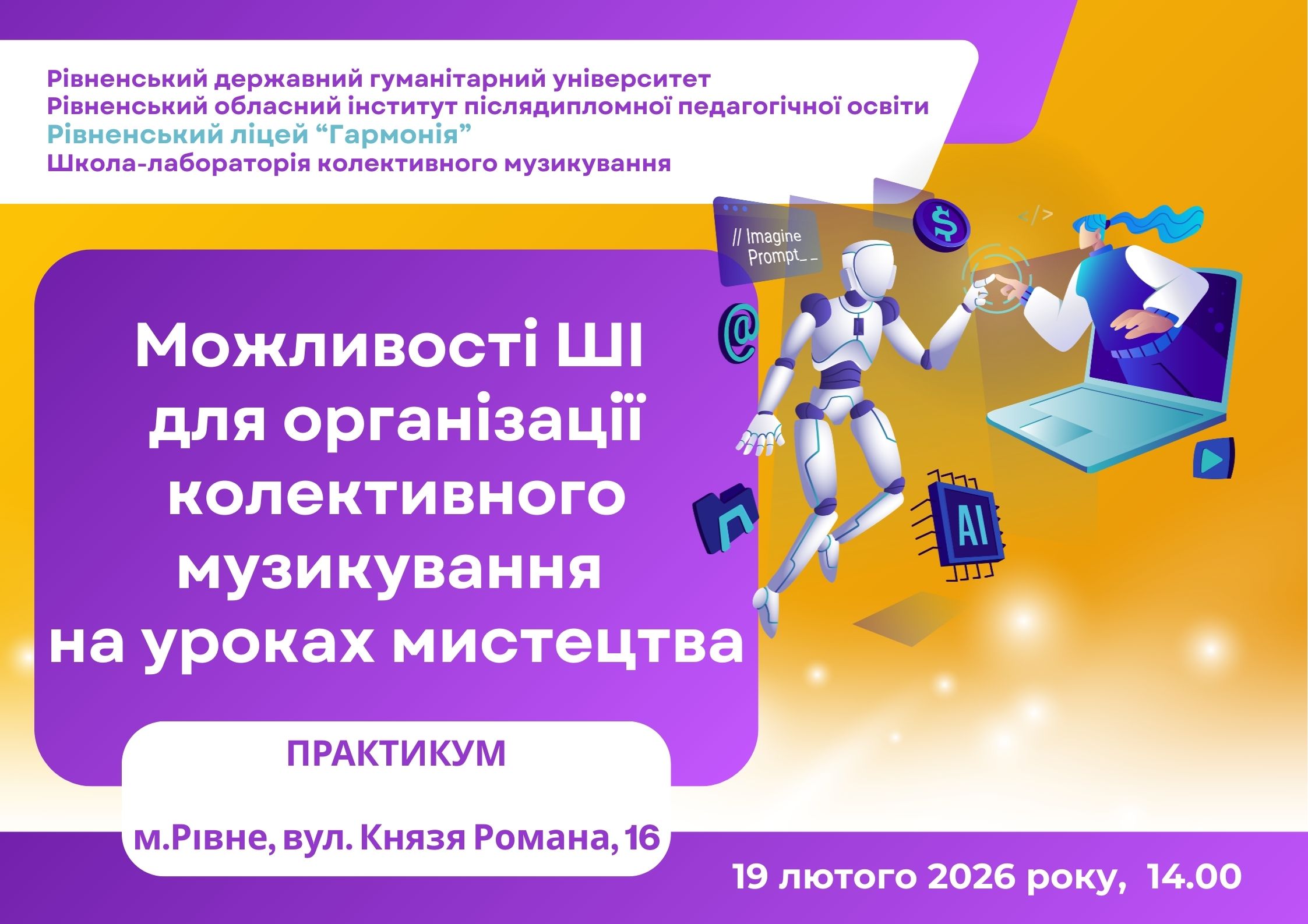 19 лютого 2026 року на базі Рівненського ліцею «Гармонія» відбувся практикум школи-лабораторії колективного музикування з теми «Можливості штучного інтелекту для організації колективного музикування на уроках мистецтва», організований Рівненським обласним інститутом післядипломної педагогічної освіти спільно з Рівненським державним гуманітарним університетом (кафедрою музикознавства, фольклору та музичної освіти).