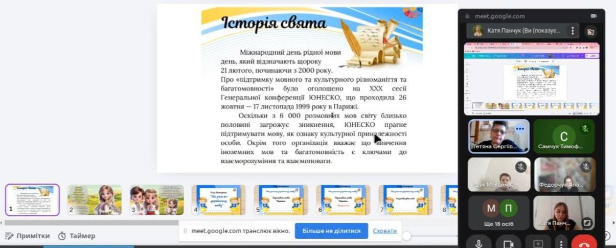 Студентка Панчук Катерина (спеціальність «Середня освіта (Українська мова і література») під час проходження виробничої практики на базі Рівненського ліцею № 13 провела мовний захід, присвячений Міжнародному дню рідної мови. Учні 6-В класу взяли активну учать у бліц-вікторині «Ми знаємо українську мову» та мовному батлі «Антисуржик». У процесі роботи застосовувалися інтерактивні методи навчання: мовна гра, командна робота, творче завдання. Мета заходу – поглиблення знань учнів про багатство й самобутність української мови.
