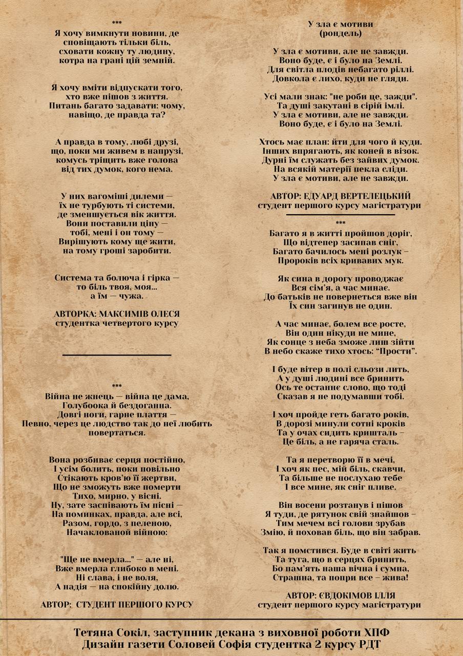 Українська пісня, високо оцінена в різні часи видатними майстрами культури та мистецтва, спонукала здобувачок освіти факультету музичного мистецтва Мирославу Герело та Олесю Васильєву (клас доцента Лілії Сверлюк) обрати для виконання віночок українських пісень Володимира Івасюка, який змусив підспівувати присутніх, засвідчивши, що українська пісня – бездонна душа українського народу, його слава.